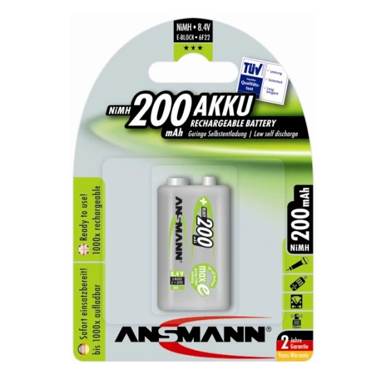 Ansmann maxE Nickel-Metall-Hydrid-Akkus, 200 mAh, ohne Memoryeffekt, d.h. kein Kapazitätsverlust bei Zwischenaufladungen, hohe Lebensdauer, bis 1000-mal wiederaufladbar, sehr geringe Selbstentladung, sofort Einsatzbereit, da vorgeladen, hohe Stromabgabe, wirtschaftlich und umweltschonend, kein spezielles Ladegerät erforderlich, Schnelladefähig, ideal für nahezu alle Anwendungen Hobby, Haushalt, Meßgeräte, Taschenlampen, Spielsachen usw.), Blisterverpackung – ideal für den Ladenverkauf, USA-Bezeichung: E, IEC Bezeichung: 6F22.
