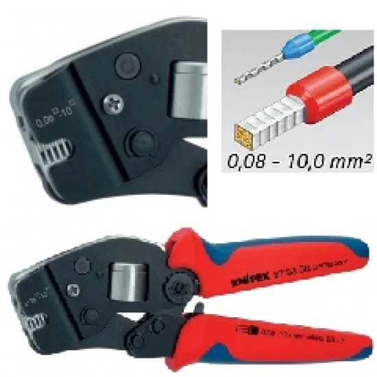 Aderendhülsenzange 0,08-10 mm², selbsteinstellende Zange zum DIN-gerechten Verpressen von Aderendhülsen, Verpressung in einem Profil von 0,08 – 10 mm², eine Vierkantpressung sorgt für stets optimale Kontaktflächen im Klemmanschluss, mit Front- und Seiteneinführung (Seiteneinführung bis 2,5 mm²), handliche, leichte Ausführung, ermüdungsfreies Arbeiten durch hohe Übersetzungskräfte und handfreundliche Griffe, mit entriegelbarer Sicherheitssperre für ein zuverlässiges Verpressen, alle beanspruchten Teile sind aus Sonderstahl und spezialvergütet. Hochwertige deutsche Qualität aus dem Haus Knipex, Wuppertal.