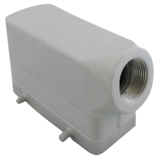 Aluminium-Druckguss Tüllengehäuse für schweren Steckverbinder 10-polig, Kabelausgang seitlich für M20 Kabelverschraubung, zur Aufnahme eines 10-poligen Buchsen- oder Stifteinsatz, Aluminium-Druckguss-Legierung mit Epoxidpulverbeschichtung auf Polyesterbasis, extra robuste Ausführung für Industrie, Schifffahrt, Chemische Werke etc., hohe Resistenz gegen chemische Umwelteinflüsse, IP66 im verriegelten Zustand, vollisoliert, für Umgebungstemperaturen von -40°C bis +125°C.