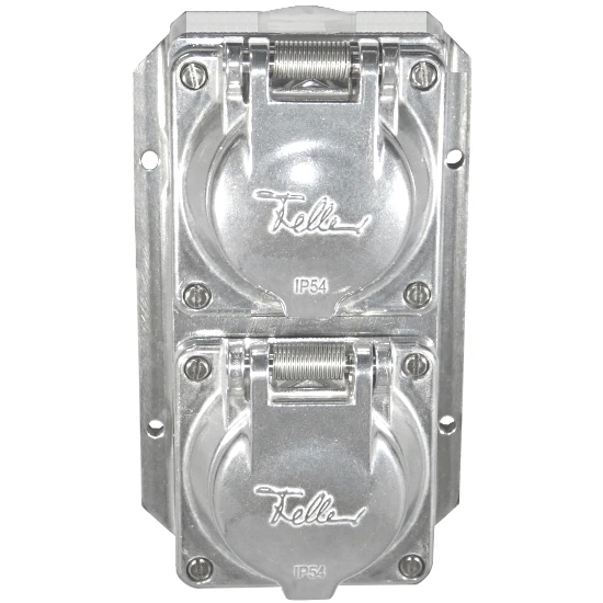 Aluminiumguss 2-fach Aufputzsteckdose mit Klappdeckel IP54 senkrecht, für extreme Einsatzbedingungen in der Industrie, Bergbau, Handwerk, Landwirtschaft, etc., 16A, 230V, IP54 für den Innen- und Aussenbereich, Schuko-Steckdoseneinsatz mit erhöhtem Berührungsschutz, Gehäuse aus Aluminium Guss, mit jeweils einer Kabeleinführungen M20 oben und unten, (Würgenippel bzw. Kabelverschraubung nicht im Lieferumfang – bitte mitbestellen).