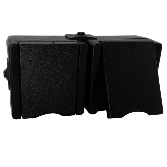 AP/FR 2-fach Steckdose waagrecht schwarz, 10A, 250V~, mit Steckklemmen bis 2,5mm² Leitungsquerschnitt, Leitungseinführung von allen 4 Seiten, großer Verdarhtungsraum, IP44, großer Verdrahtungsraum, IP44, hohe Materialqualität durch thermoplastischen Kunststoff, pflegeleichte Oberfläche, Farbe schwarz.
