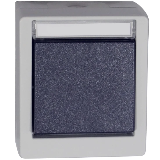 AP/FR Aus- und Wechselschalter/Taster, 10A, 250V~, Universalschalter – einsetzbar als Ausschalter, Wechselschalter und durch einfaches Einrasten der Tastfeder als Taster mit Schließer- und Öffnerkontakt einsetzbar, mit Steckklemmen bis 2,5mm² Leitungsquerschnitt, Schutzgrad IP55, hochwertiges 2 Komponentenmaterial mit angespritzten Dichtungen, mit Beschriftungsfeld, großer Anschlußraum, UV-stabilisiert und schlagzäh (IK 07 geprüft – Festigkeit gegen Stöße mit einer Schlagenergie von bis zu 2,00 J), VDE bzw. NF geprüft – hergestellt in Deutschland, pflegeleichte Oberfläche, Farbe hellgrau/stahlblau, Maße 86 x 76 x 57mm (HxBxT).
