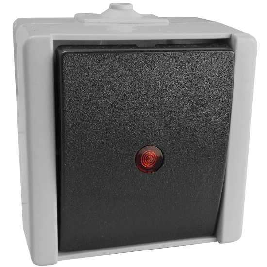 AP/FR Kontrollschalter mit Glimmlampe, 10A, 250V AC, großer Anschlußraum, modernes Erscheinungsbild und zeitgemäße Farbgebung, hohe Materialqualität durch hochwertige thermoplastische Kunststoffe, halogenfrei, mit Steckklemmen bis 2,5mm² Leiterquerschnitt, grau/dunkelgrau glänzend, IP44, selbstdichtenden Weichmembraneinführungen.