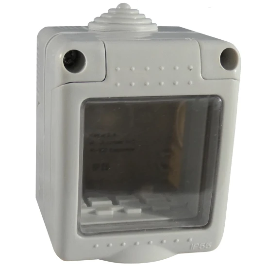AP/FR Leergehäuse mit transparentem Klappdeckel IP55 in 45mm Norm, zur Aufnahme eines 45mm Moduls oder zwei 22,5mm Module, IP55 für den Innen- und Aussenbereich, robuste Ausführung mit Membrane im Deckel, mit jeweils einer Kabeleinführungen M20 oben, seitlich und im Gehäuseboden, Maße 66 x 82 x65mm, Deckelschrauben aus Edelstahl. zum Einsatz im 45mm System.