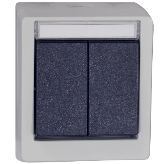 AP/FR Serienschalter, 10A, 250V~, mit Steckklemmen bis 2,5mm² Leitungsquerschnitt, Schutzgrad IP55, hochwertiges 2 Komponentenmaterial mit angespritzten Dichtungen, mit Beschriftungsfeld, großer Anschlußraum, UV-stabilisiert und schlagzäh (IK 07 geprüft – Festigkeit gegen Stöße mit einer Schlagenergie von bis zu 2,00 J), VDE bzw. NF geprüft – hergestellt in Deutschland, pflegeleichte Oberfläche, Farbe hellgrau/stahlblau, Maße 86 x 76 x 57mm (HxBxT).