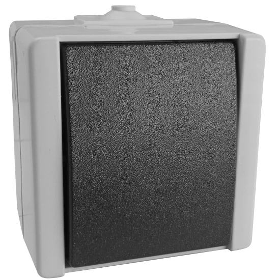 AP/FR Taster, Wechsler, 10A, 250V AC, großer Anschlußraum, modernes Erscheinungsbild und zeitgemäße Farbgebung, hohe Materialqualität durch hochwertige thermoplastische Kunststoffe, halogenfrei, mit Steckklemmen bis 2,5mm² Leiterquerschnitt, grau/ dunkelgrau glänzend, IP44, selbstdichtenden Weichmembraneinführungen.