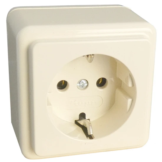 Schutzkontakt-Steckdose, Aufputz, stabile hochwertige Ausführung, seitliche Ausbrechöffnung, 16A, 250V, IP20 für den Innenbereich, Farbe cremeweiß.