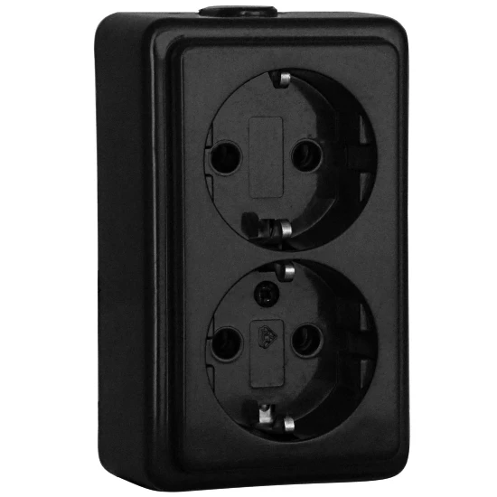 Schutzkontakt-Zweifachsteckdose, waagrechte oder senkrechte Montage möglich, Aufputz, stabile hochwertige Ausführung, seitliche Ausbrechöffnung, 16A, 250V, IP20 für den Innenbereich, Farbe schwarz.
