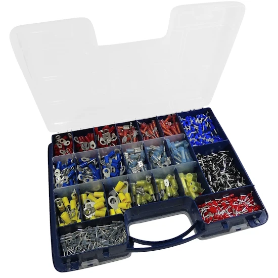 Beidseitige Sortimentsbox „Alles-Drin“, doppelseitig bestückte Sortiments-Box, stabiler, praktischer Kunststoffkasten 285 x 210 x 75 mm mit 32 Fächern, bestückt mit isolierten Aderendhülsen und Kabelverbindungen, Kabelbindern, Schrumpfschläuchen und Isolierbändern, Farbreihe nach DIN, bestehend aus: