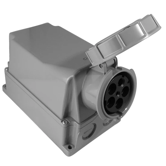 CEE Wandsteckdose 125A 5-polig 1h für Notstromeinspeisung IP67 gemäß DIN VDE 0100-551, >50V, 1h, Leitungseinführung von oben (1 mal M63), von unten (2 mal M40) oder hinten, Gehäuse um 180° drehbar, schwere stabile Ausführung, beständig gegen eine Vielzahl von Chemikalien, halogen- und silikonfrei, ergonomische griffige Bauform, ausgezeichnete Schlagzähigkeit IK 08, Kontakte aus Kupfer-Zink-Legierung für eine hohe elektrische Leitfähigkeit, Kabelverschraubung mit integrierter Zugentlastung, 960°C Glühdrahtgeprüft, Selbstverlöschungsgrad VO (UL94), Schutzgrad IP67 (Schutz gegen zeitweiliges Eintauchen in Wasser, staubdicht), mit Pilotkontakt, Leitungsquerschnitt 16 bis 70mm² (flexible Adern bis 50mm²), Maße 387 x 142 x 209mm LxBxH.