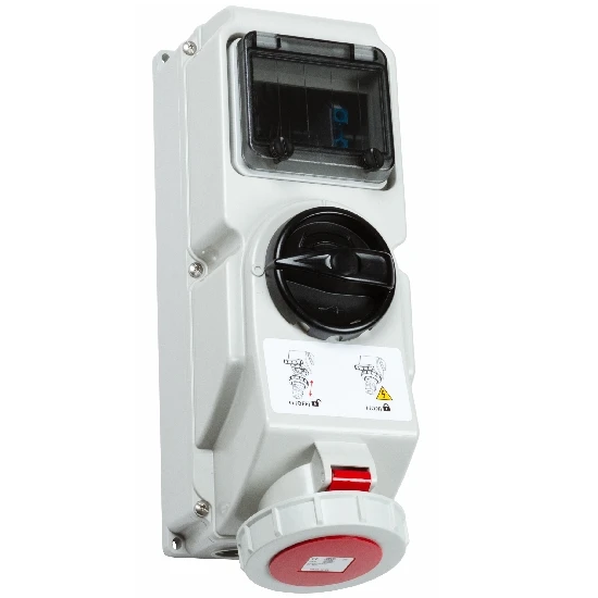 CEE Wandsteckdose 32A 5-polig abschaltbar mit DIN-Normtragschiene zum Einbau von Sicherungselementen wie Leitungsschutzschalter oder FIs (5 Teilungseinheiten), 400V, 6h, nach IEC/EN 60309 und VDE0623, Schalter