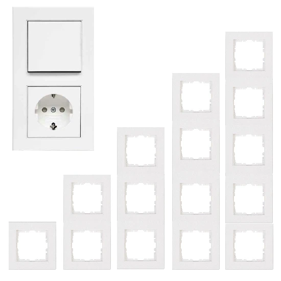Design Abdeckrahmen 4-fach, 55mm System arktisweiß, für waagrechte und senkrechte Montage, klare Linien und eckige Kanten – modern und absolut im Trend, sehr gute Haptik, leicht zu reinigende Oberfläche.