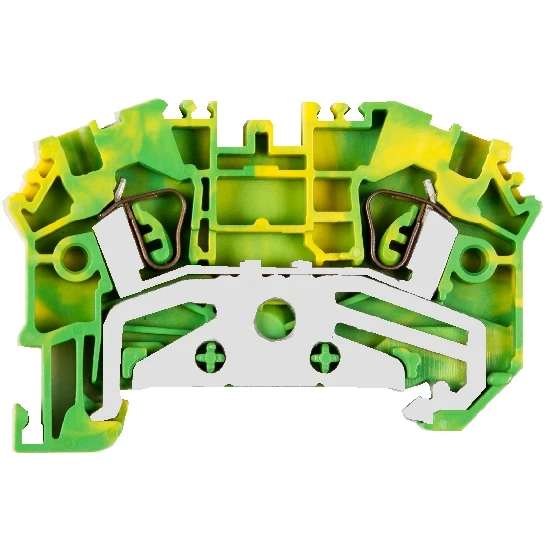 Durchgangsklemme grün-gelb für Schutzleiter, automatische Verbindung zur Tragschiene durch einen Kontaktfuß am Klemmenboden, Farbe grün-gelb, Breite: 5,1mm, Zugfeder-Anschluß-System, für eindrähtige (starre) und feindrähtige Leiter von 0,5 bis 4mm² (mit Aderendhülsen bis 2,5mm²).
