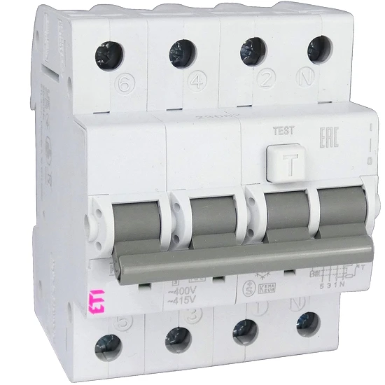 Kombination aus Fehlerstromschutzschalter und Leitungsschutzschalter, bietet universellen Überstrom-, Kurzschluss- und Personenschutz in einem Gerät, 400V, 6kA, 32A, C-Charakteristik, 4-polig (3+N), Bemessungsfehlerstrom 0,03A (30mA), Kurzschlussfest bis 10kA, Etimat Baureihe, Berührungsschutz nach DIN VDE 0106 Teil 100, Abschaltung (im Fehlerfall) gemäß DIN VDE 0664, Anschluß über Einzelader oder Sammelschiene bis 25mm² gleichzeitig möglich, optische Schaltstellungsanzeige, Breite 4 Teilungseinheiten, Hersteller ETI.