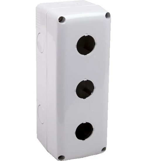 Gehäuse für 22mm Befehls- und Meldegeräte, Schutzgrad IP66 für den Innen- und Außenbereich, mit drei 22mm Bohrungen, 6 vorgeprägte M25 Einführungen, Maße 66 x 171 x 65mm (HxBxT).