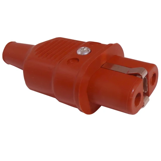 Heißgerätesteckdose (Kupplung) nach ehemals DIN49491 „Waffeleisenstecker“, mit Schutzkontakt, max. Temperatur 200°C, 230V, 16A, mit Knickschutztülle, Vorsatzstück rot, Hülse rot, aus Silopren.