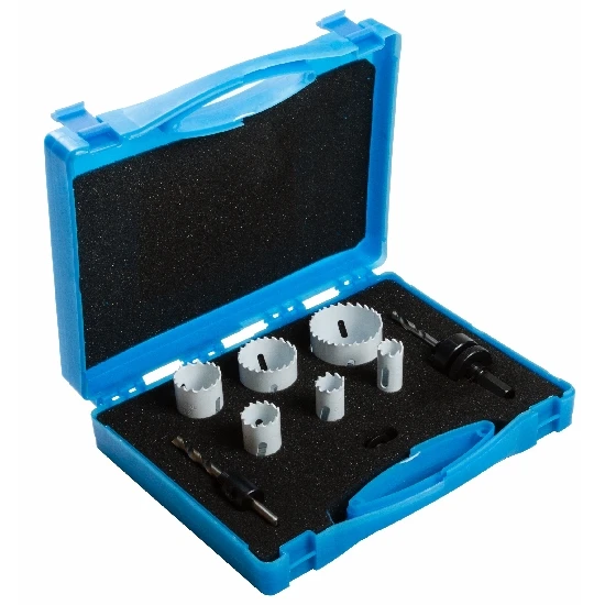 HSS-Lochsägen Set 8-teilig im Kunststoffkoffer, mit 6 Lochsägen in den Größen (19/22/29/38/44/57mm) und jeweils ein Aufnahmehalter für kleine und große Lochsägen, universell einsetzbar, für Metall, Guss, NE-Metall, Aluminium, Holz, Faserplatten und Kunststoff. Mit Kobald-legierten Zähnen, präzise Schnitte und hohe Standzeit durch Bi-Metall schneiden, Schnitttiefe: max: 38mm.