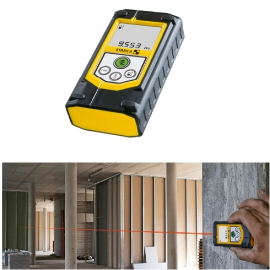Stabila Laser Entfernungsmesser zum Messen von Länge, Fläche und Volumen, Tracking (Dauermessung), Pythagoras-Funktion mit zwei und drei Messpunkten, Minimum und Maximum Tracking, ingesamt 8 Funktionen, Reichweite 0,1 bis 40m, große Ziffern, beleuchtetes Display, handlich, Leistung < 1mW, Genauigkeit 2mm, inkl. Batterien (Betriebsdauer der Batterien bis zu 3.000 Messungen), inkl. Gürteltasche zum sauberen Aufbewahren, deutsches Qualitätsprodukt.