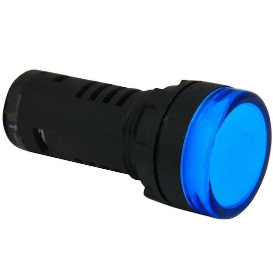 LED Einbau-Signalleuchte mit sehr heller LED (40-60cd/m²), Lampentestfunktion, Lebensdauer ca. 50.000h, Einbaudurchmesser 22mm inkl. Überwurfmutter, 230V AC, IP65 (Rückseite IP20), Abmessungen 29mm x 51/63mm (Durchmesser x Länge), Farbe blau.