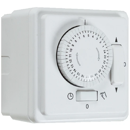 Mechanische Aufputz Rollladentageszeitschaltuhr, zur Wandmontage, Analoggerät – einfache Programmierung der Schaltzeit über Schiebereiter, Komplettgerät in reinweiß, 230V, 6(2)A, 1 Wechsler, zwei Schalter für Automatik – Ein – Aus und Auf -Ab, kürzeste Schaltzeit 30 min., Schaltleistung 1.000W, Leistungaufnahme 1,6W, IP20 für den Innenbereich, Maße 81 x 81 x 60mm LxBxT.