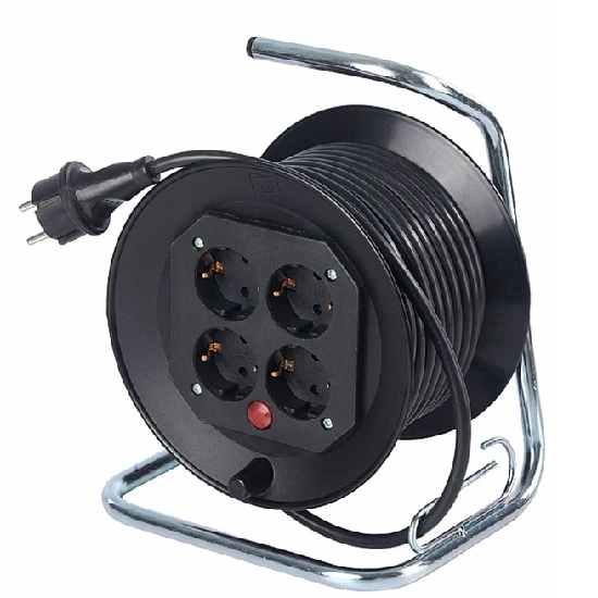 Mini Kabeltrommel aus robustem, hochbruchfestem Spezialkunststoff, stoßdämpfendes, stabiles, verzinktes Fußgestell, 15m H05VV-F Kunststoffmantelleitung, Thermoschutzschalter mit Funktionsautomatik und 4 Schutzkontaktsteckdosen, 230V/16A, 3.500W, schwarz.