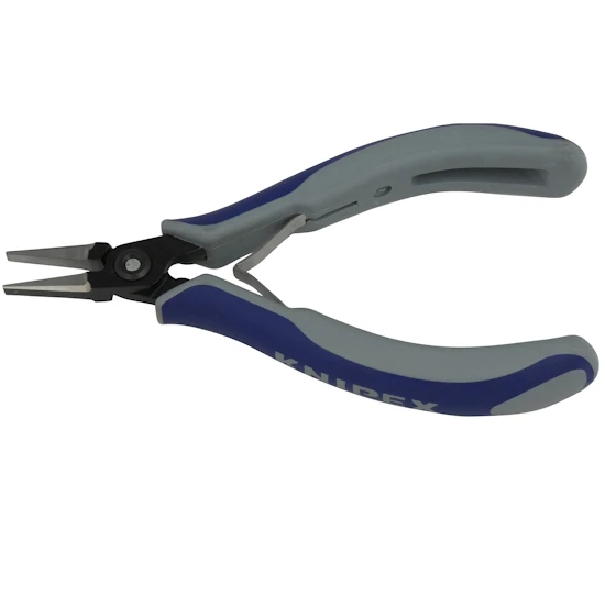 Präzisions Elektronik Greifzange 130mm, flache breite Backen, langlebig und rostfrei, für feinste Montagearbeiten, z. B. in Elektronik und Feinmechanik, zum Greifen, Halten und Biegen, glatt geschliffene Greifflächen, Kanten fein verrundet, ca. 20 % weniger Gewicht als konventionelle Elektronikzangen, geschraubtes Gelenk und sorgfältig gefertigte Gelenkflächen für gleichmäßige, reibungsarme Bewegung im gesamten Öffnungsbereich, leichtgängige Doppelfeder für ein sanftes und gleichmäßiges Öffnen, ergonomisch optimierte Mehrkomponenten-Hüllen, Hersteller Knipex, Wuppertal.