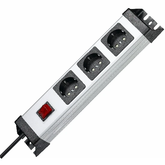 Professionelle Schutzkontakt-Steckdosenleiste, robust, schlag- und bruchfest, für den universellen Einsatz, 250V, 16A, mit 1,4m Zuleitung H05VV-F 3×1,5mm² (wiederanschließbar – einfacher Austausch der Zuleitung), um 90 Grad gedrehte Steckdosentöpfe mit besonders großen Abständen von 65mm – eignen sich speziell für Winkelstecker und große Steckernetzteile (kein Steckplatzverlust bei Netzteilen, Zeitschaltuhren usw.), Befestigungsmöglichkeit zur Wand-, Decken- und Möbelmontage, serienmäßig mit erhöhtem Berührungsschutz (Kinderschutz), mit 2-poligem, beleuchtetem Schalter, Maße: 352 x 71 x 58mm (LxBxH), Farbe: Schwarz-silber.