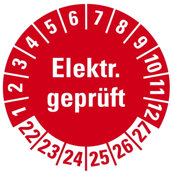 Prüfplakette „Elektrisch geprüft“ – Bogen mit 10 Plaketten, Durchmesser 20mm, selbstklebend, witterungsbeständig und fälschungssicher.