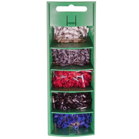 Praktische Schiebebox zum einfachen entnehmen der Aderendhülsen, Aderendhülsen isoliert, 400 Stück von 0,5 bis 2,5mm², gemäß DIN 46228, jeweils 50 Stück von 0,50mm² und 2,5mm² und jeweils 100 Stück von 0,75mm², 1,0mm² und 1,5mm², mit Isolierung (Kunststoffkragen), Abmessung und Farbcode gemäß DIN 46228 Teil 4, Material E-Cu gemäß EN 13600, galvanisch verzinnt, mit Polypropylen-Einführtrichter, für fein- und feinstdrähtige Leiter der Klasse 5 und 6, halogenfrei.