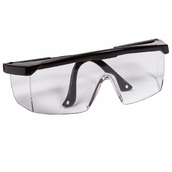 Schutzbrille nach EN166, Profilrahmen mit einstellbaren Bügeln, schwarz aus Polycarbonat.