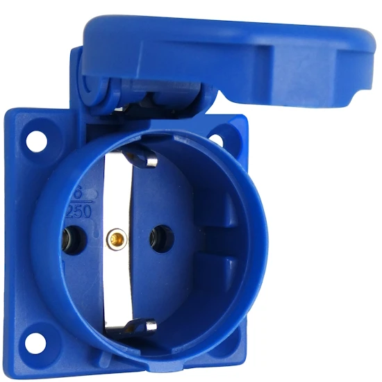 Schutzkontakt Einbau Steckdose IP54 für ortsveränderlichen Einsatz z.B. in mobilen Energieverteilern, mit eingelassenen Dichtrand nach DIN VDE 0620-1-2010, angespritzte Flanschdichtung, spitzwassergeschützte Ausführung mit selbstschließendem Klappdeckel, IP54, robuste, schlaggeschützte Ausführung aus hochwertigem Polyamid, großer Klappdeckel-Öffnungswinkel, Berührungsschutz nach VBG4, 250V, 10/16A, Lochmaßdurchmesser 4,3mm, Flanschmaß 50x50mm, Abstand der Befestigungslöcher 38x38mm, rückwärtige Leitungszuführung, blau.