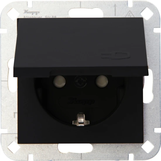 Schutzkontakt Steckdose mit Federklappdeckel schwarz matt, 250 V AC, 10/16 A, mit Steckklemmen für Leitungsquerschnitte bis 2,5 mm², Farbe schwarz matt, mit Federklappdeckel – selbstschließend – in allen Einbaulagen.