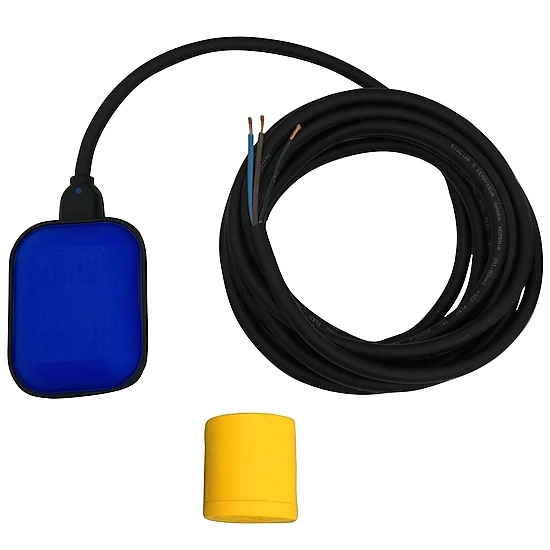 Niveauregler (Schwimmschalter) für die Regulierung (Füllen/Leeren) von Flüssigkeitsständen durch Schalten von Pumpen, Magnetventilen, Alarmvorichtungen etc., aus ungiftigem Polypropylen (auch für Lebensmittelflüssigkeiten geeignet), mit Gegengewicht, Schaltleistung 10 (8)A, Betriebstemperatur von 0 bis 50°, Druckwiderstand 2 Bar, IP68, mit 5m Neoprenanschlußleitung 3x1mm²