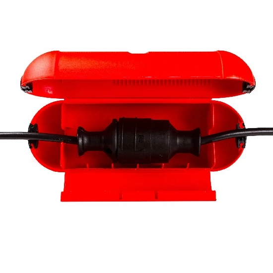 Sicherheitsbox zum sicheren Verbinden von Kupplung und Stecker, spritzwassergeschützt IP44, verwendbar im Garten, Keller, Camping Aussenbeleuchtung uvm., Gehäuse aus schlagfestem Polypropylen mit Gummidichtungen, für Leitungen von 5 bis 8mm Durchmesser (z.B. 3×1,5), Maße 210 x 85mm (LxD) Farbe rot.
