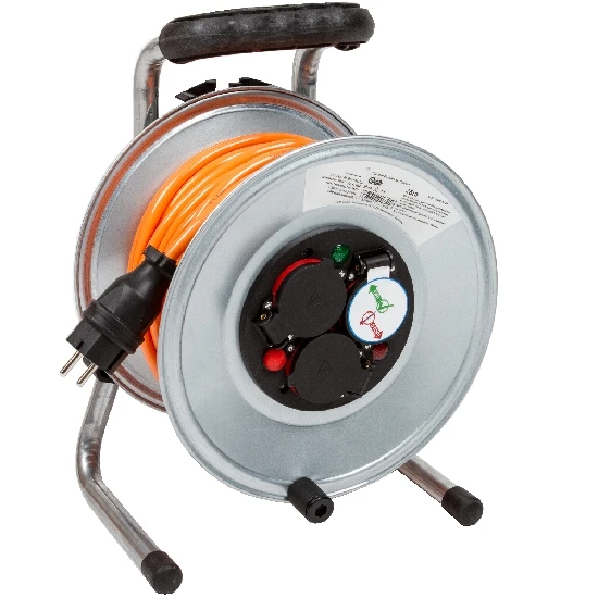 Stahlblech-Kabeltrommel, Trommelkörper aus feuerverzinktem Stahlblech mit 3 Schutzkontaktsteckdosen mit Klappdeckel, ergonomischer und isolierter Bügelgriff, Rotationsstopp-Schalter, Trommeldurchmesser 255mm, Diagnosesystem mit Statusanzeige, Komplett-Erdung für höchste Sicherheit, Leitungstype H07BQ-F (Panzerkabel), 3-adrig, 1,5mm², hohe Schnitt- und Abriebfestigkeit, widerstandsfähig gegen Mineralöle und -fette, Einsatztemperatur von -40 C° bis + 90C°, ideal für Umgebungen wo Quetsch- und Abriebgefahr z.B. durch Stapler, LKW, Bagger, Bahnen etc, Farbe orange (ähnl. RAL 2003) 25m, eingebauter Thermoschalter mit Wiederanlaufschutz gegen Überhitzung, IP44, 230V/16A, 3500W, für die Verwendung im Freien, in industriellen, gewerblichen und landwirtschaftlichen Betrieben und auf Baustellen, hergestellt in Deutschland.