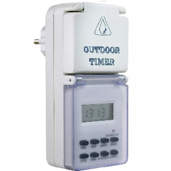 Steckdosenzeitschaltuhr, elektronisch mit LCD-Anzeige, Schaltleistung 3500W, kürzeste Schaltzeit 1min, Tages- und Wochenprogramm, Zufallsfunktion, 8 Programme, Handtaste für manuelle Schaltung ohne Programm, integrierte Kindersicherung, Staub- und spritzwasserfeschützt (IP44), für den Außenbereich und den Einsatz in Feuchträumen.
