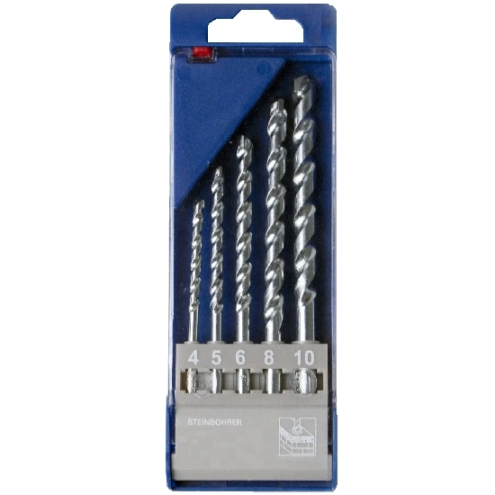 Steinbohrer-Set 5-teilig, je 1x von 4/5/6/8/10mm, in Kunststoff-Kassette, vernickelte Ausführung, für Bohrarbeiten in Dreh- und Schlagbohrmaschienen, deutsches Qualitätswerkzeug.