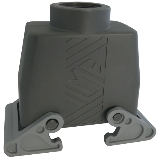 Tüllengehäuse für schweren Steckverbinder 24-polig, Kabelausgang gerade für M32 Kabelverschraubung, mit Bügel als Gegenstück zu herkömmlichen Tüllengehäusen um flexible Steckverbindungen zu realisieren, zur Aufnahme eines 24-poligen Buchsen- oder Stifteinsatz, robuste Ausführung für Industrie, Schifffahrt, Chemische Werke etc., hohe Resistenz gegen chemische Umwelteinflüsse, selbstverlöschender Kunststoff, antistatisch, IP65 im verriegelten Zustand, vollisoliert, für Umgebungstemperaturen von -40°C bis +90°C..