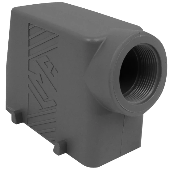 Tüllengehäuse für schweren Steckverbinder 24-polig, Kabelausgang seitlich für M32 Kabelverschraubung, zur Aufnahme eines 24-poligen Buchsen- oder Stifteinsatz, robuste Ausführung für Industrie, Schifffahrt, Chemische Werke etc., hohe Resistenz gegen chemische Umwelteinflüsse, selbstverlöschender Kunststoff, antistatisch, IP65 im verriegelten Zustand, vollisoliert, für Umgebungstemperaturen von -40°C bis +90°C.
