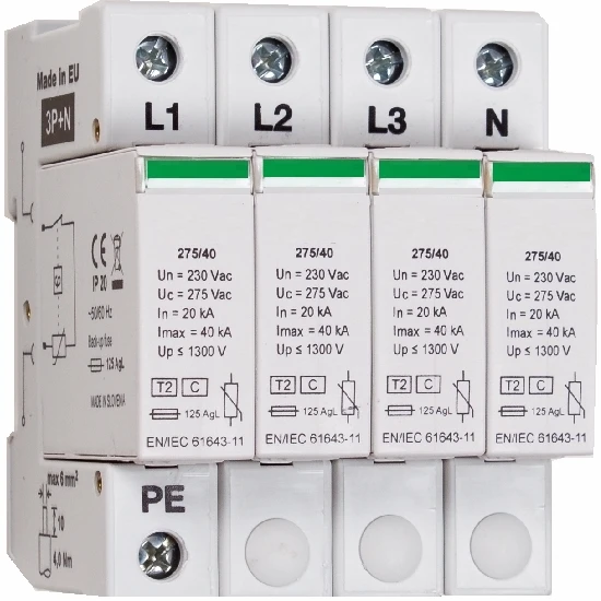 3-poliger Überspannungsableiter + Nullleitermodul Typ 2, steckbare (austauschbare) Schutzmodule erlaubt den schnellen und unkomplizierten Austausch im Fehlerfall, optische Defektanzeige, moderne Varistortechnik, nach EN/IEC 61643-11, Imax = 40kA, Up <= 1.300 V, In = 20 kA, 230V, Breite 4 Teilungseinheiten