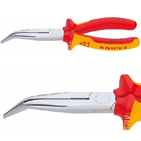 VDE Flachrundzange 45° (Telefonzange) 200mm, isoliert mit Mehrkomponenten-Griffe, geprüft nach DIN EN 60900, 1.000V, hoch belastbare, elastische Präzisionsspitzen, flach-runde, lange Backen, Greifflächen gezahnt, mit Schneiden für mittelharten Draht Ø 3,2 mm und harten Draht Ø 2,2 mm, Schneiden zusätzlich induktiv gehärtet, Schneidenhärte ca. 61 HRC, Vanadin-Elektrostahl, geschmiedet, ölgehärtet, deutsches Qualitätswerkzeug von Knipex.