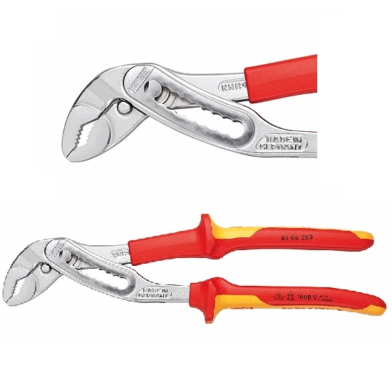 VDE Wasserpumpenzange „Alligator“, isoliert mit Mehrkomponenten-Griffe, geprüft nach DIN EN 60900, 1.000V, nach DIN ISO 8976, selbstklemmend an Rohren und Muttern, durchgestecktes Gelenk, verchromt, 250mm, 2″, deutsches Qualitätswerkzeug von Knipex.