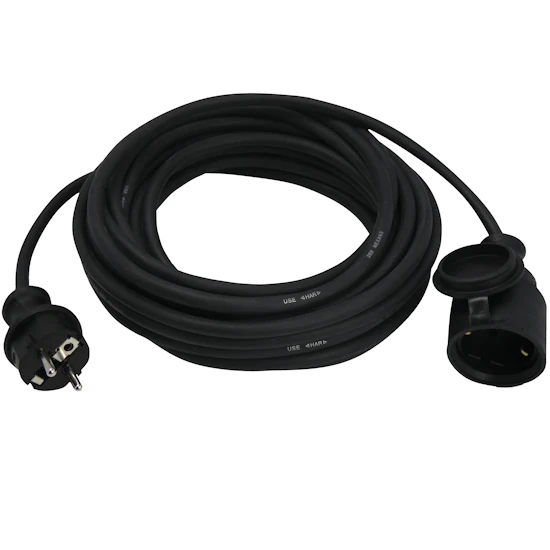 Schutzkontaktverlängerung 25m, IP44 für den Innen- und den Außenbereich mit leichter Gummischlauchleitung H05RR-F 3G1,5mm², mit angespritztem Gummistecker und Gummikupplung. Farbe schwarz.