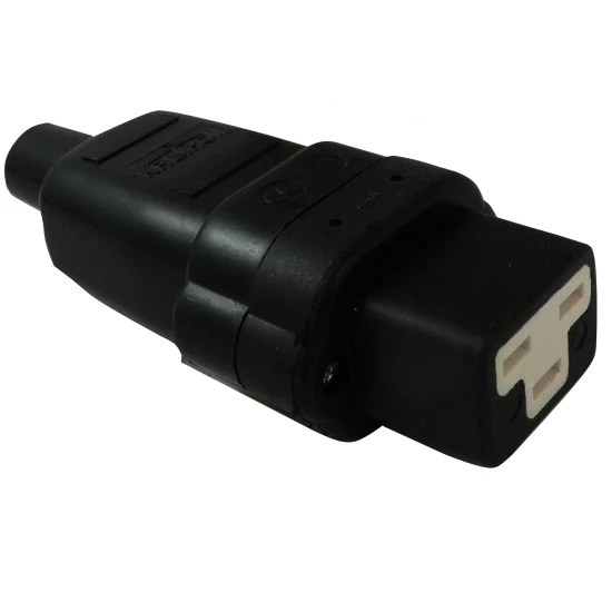 Vollgummi Kaltgerätesteckdose (Kupplung) Typ C19, nach IEC 60320-1, max. Temperatur 70°C, 230V, 16A, mit Knickschutztülle, schwarz.