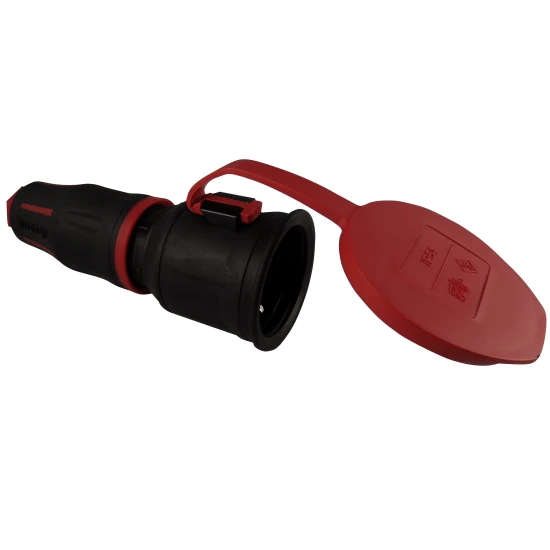 Vollgummikupplung „Top Taurus“ mit schraubenloser Zugentlastung, mit Deckel, extrem schnelle Montage durch die außenliegende schraubenlose Zugentlastung, sichere, robuste, griffige Bauform, für Anschlußquerschnitte bis 2,5mm², schwarz/rot, IP44 (spritzwassergeschützt), einfaches Montieren und Demontieren der Kontaktträger.