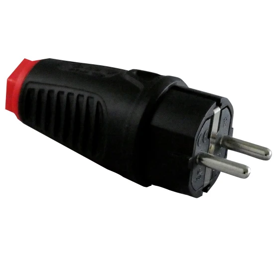 Vollgummistecker „Taurus“, sichere, robuste, griffige Bauform, Vollgummiversion (Haube und Kontaktträger aus TPE), für Anschlußquerschnitte bis 2,5mm², schwarz/rot, IP54 (spritzwassergeschützt), einfaches Montieren und Demontieren der Kontaktträger, großer Anschlussraum, leicht bedienbare Zugentlastungselemente mit offenen Schrauben, alle Kontaktschrauben sind aus einer Richtung bedienbar.