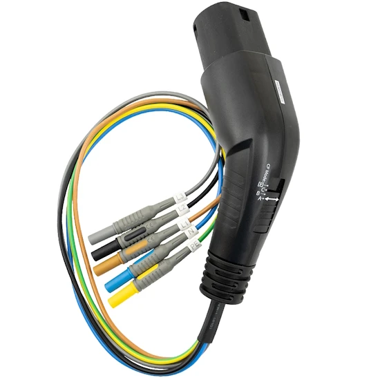 Wallbox (EVSE) Adapter für Installationstester Testboy TV 456, unterstützt alle relevanten Messungen des TV 456, zum Verbinden des Installationstesters mit der Ladestation, der Wallbox Adapter wird einfach zwischen der Wallbox (Typ-2-Stecker) und den Messeingängen des TV 456 angeschlossen, alle Adern des Ladesteckers verfügbar L1, L2, L3, N, PE, CP und PP, für alle typischen Installationsmessungen Spannung, Frequenz, Phasenanzeige, Phasenfolge, verschiedene RCD-Tests und -Messungen, Isolationswiderstand, Niederohmmessungen, Leitungs- und Schleifenimpedanzen.