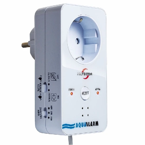 Wassermelder – Steckdosenadapter mit Schaltkontakt, erkennt Wasser und löst sofort einen lauten Alarm (85dB) aus, gleichzeitig schaltet der Wassermelder das angeschlossene Gerät je nach Einstellung Ein oder Aus, so läßt sich z.B. eine Pumpe einschalten oder eine Waschmaschine bei Wasseralarm ausschalten, ideal für Badezimmer, Waschküchen, Hauswirtschaftsräumen etc., 2m lange Sensorleitung (kürzbar), für den Innenbereich, Kontrolleuchte zur Überprüfung der Funktion, max. Schaltleistung 1.800 Watt, Alarmlautstärke einstellbar, Kontrolleuchte für Alarm- und Statusanzeige, 230V, Maße 110 140 x 65mm BxHxT.