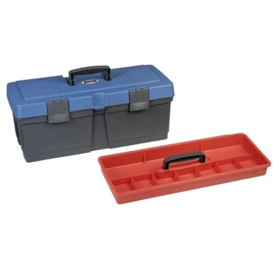 Robuster Werkzeugkoffer aus hochschlagfestem Polypropylen für Handwerk, Industrie und den anspruchsvollen Heimwerker, Trageeinsatz mit versenkbarem Handgriff, ideal auch als Materialkoffer und Servicekoffer, versenkbarer Griff, stabile Schaniere aus verzinkten Metallachsen, Stauraum ca. 13 Liter, 16 Zoll (410x225x185mm LxBxH), Farbe schwarz/blau.